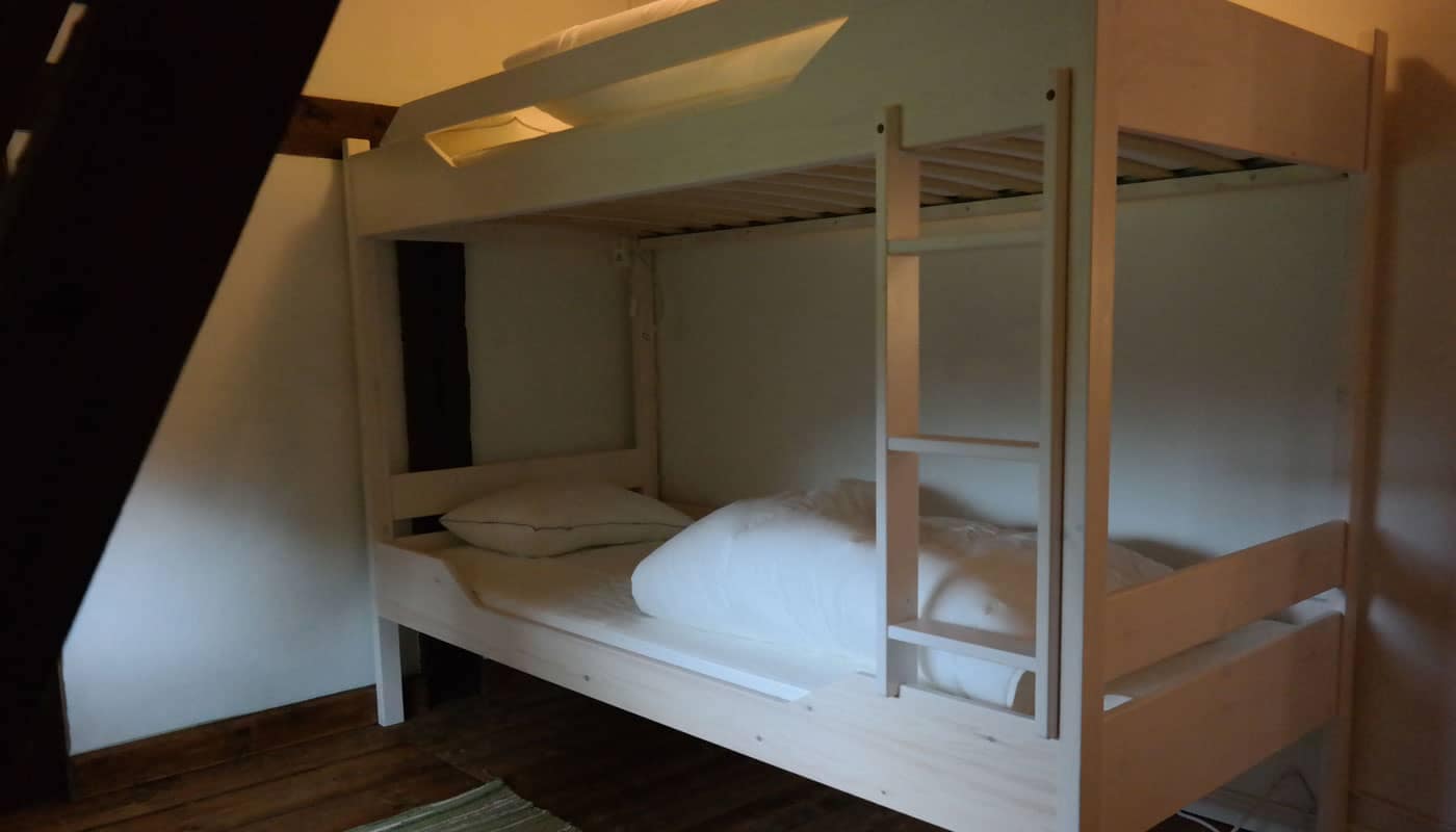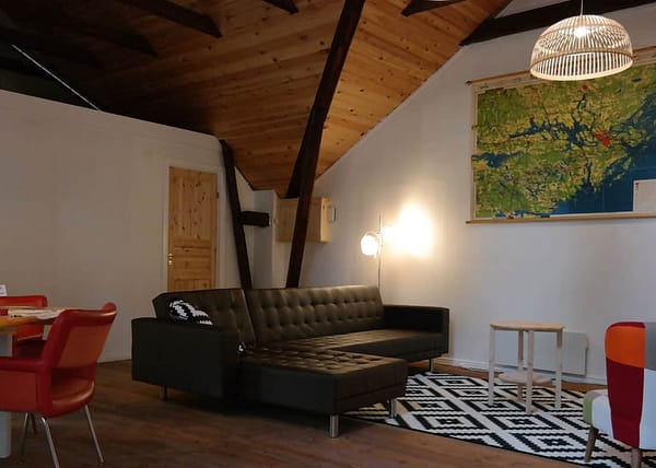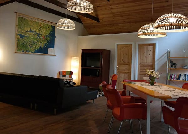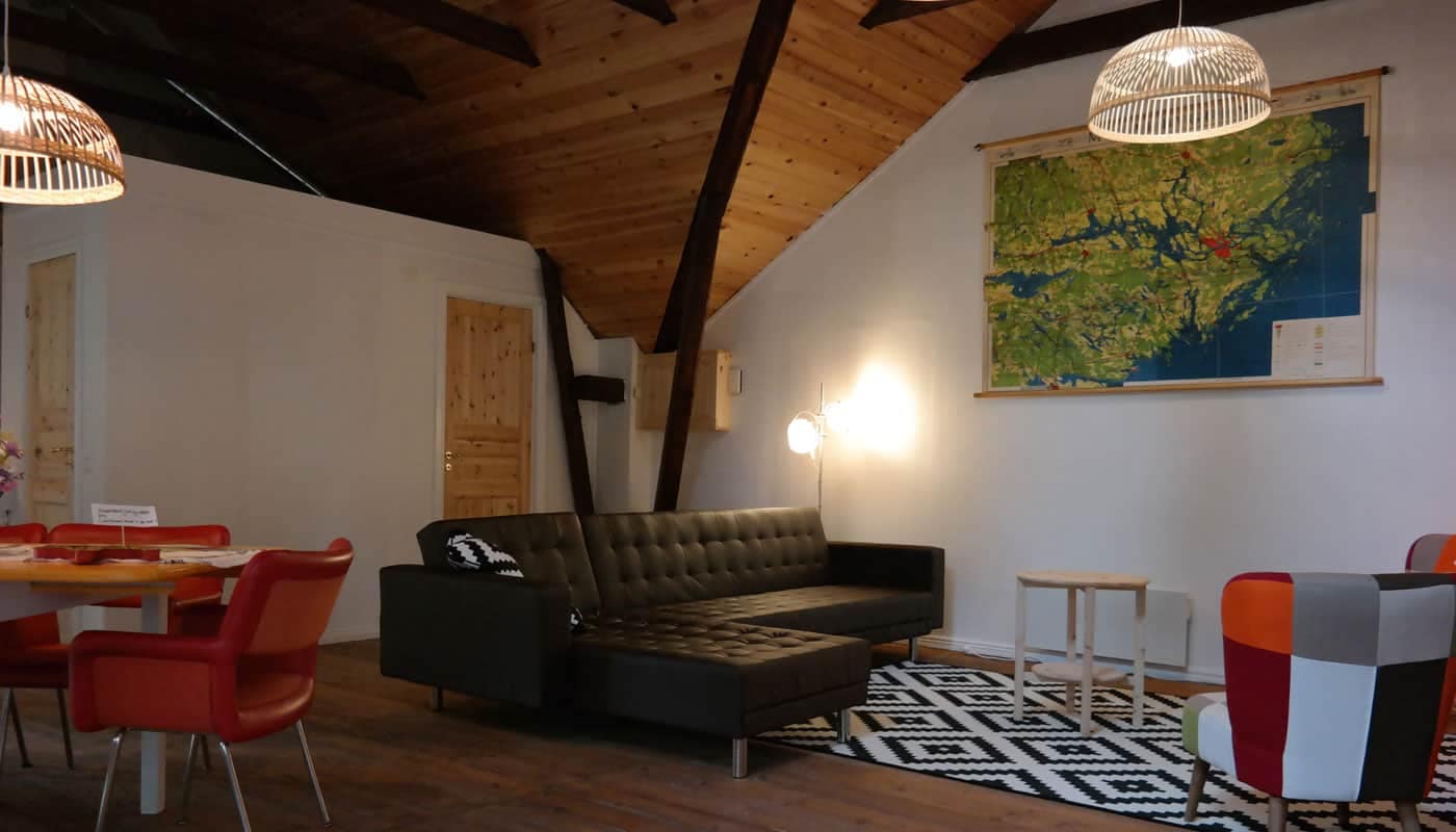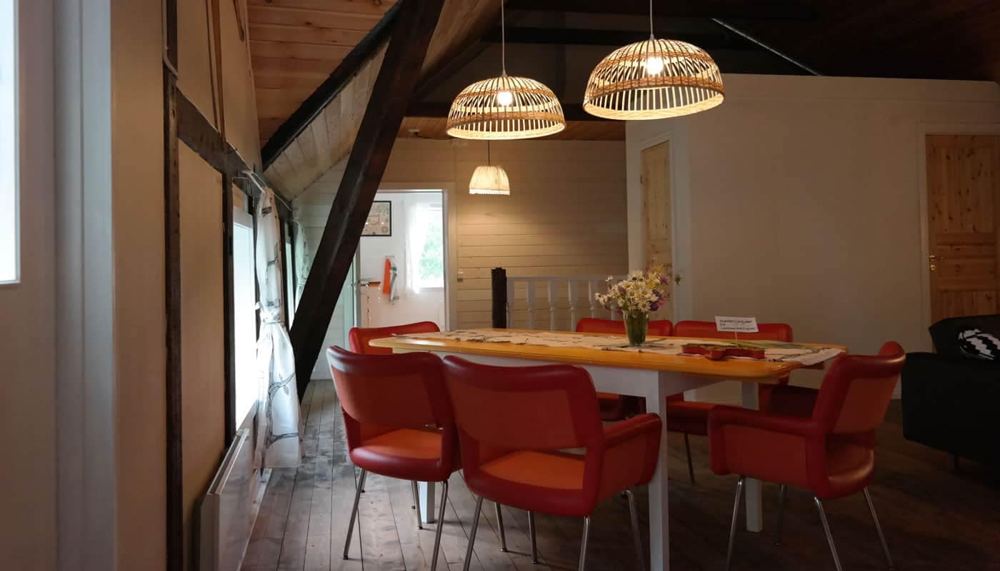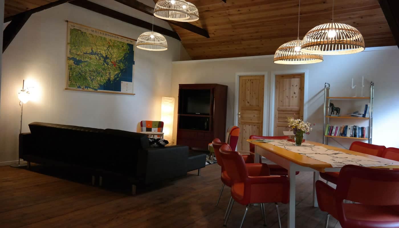 Het vakantiehuis bevindt zich op de hooizolder van de schuur op onze boerderij. De vakantiewoning wordt gekenmerkt door hoge plafonds en de keuken en grote slaapkamer bevinden zich in voormalige dienstvertrekken. Het huis is aangepast aan de moderne tijd. Aan de muren hangt kunst van een lokale kunstenares, Malin Lidén. Zij vertelt: